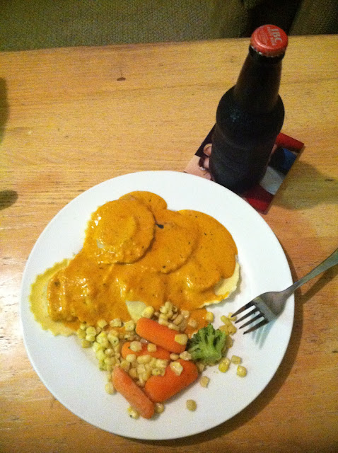 then, we possibly made the most delicious meal we have ever made. roasted red pepper sauce with portobello mushroom raviolis. probably our top favorite recipe right now. no seriously.